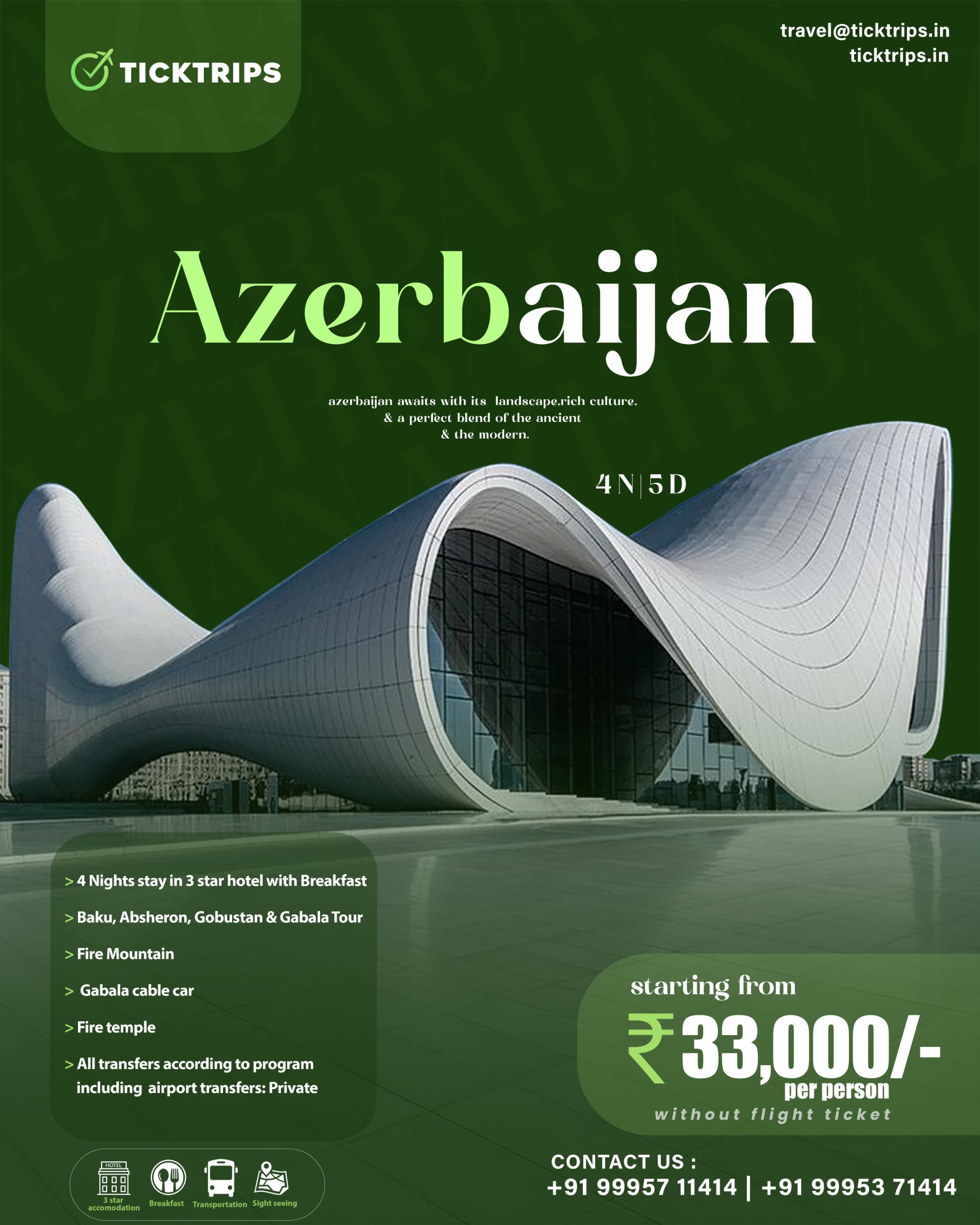 Where Tradition Dances with Modernity! Azerbaijan is a land of contrasts—where flame-shaped skyscrapers rise above ancient streets, and the Caspian Sea hugs dramatic mountain landscapes. Explore Baku’s futuristic charm, wander through ancient Silk Road towns, and soak in the rich culture and cuisine. With TickTrips, your Azerbaijani escape is perfectly planned, effortlessly smooth, and truly unforgettable.