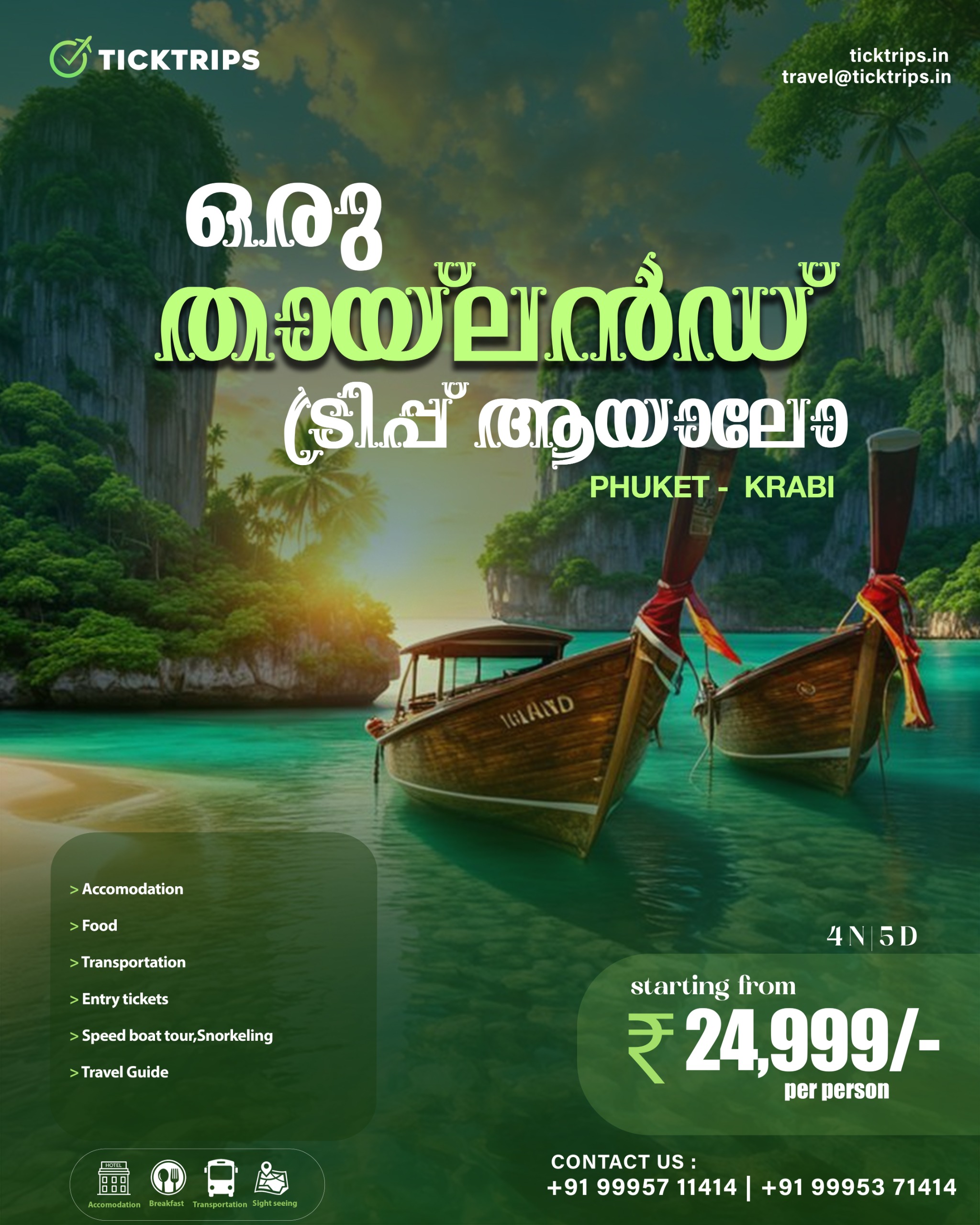 Tropical Bliss Awaits! Thailand’s Phuket and Krabi are a dream duo of sun, sea, and serenity. Dive into crystal-clear waters, wander through vibrant night markets, and explore limestone cliffs and hidden lagoons. At TickTrips, we craft seamless and memorable escapes that let you experience the best of Thailand’s coastal charm—relaxed, refreshed, and truly inspired.