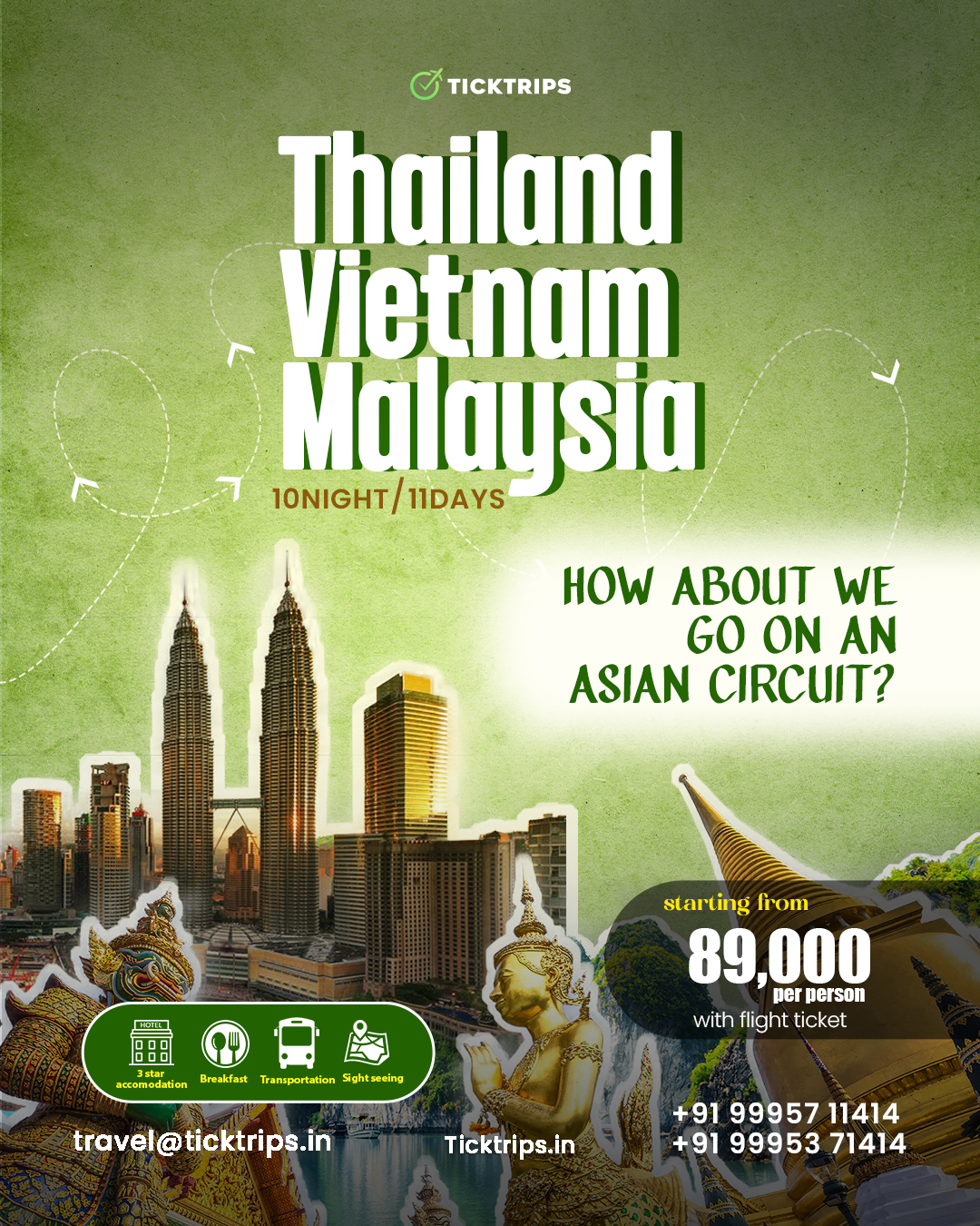 Embark on the Pan ASEAN Circuit – a journey that takes you through the cultural heartbeats of Thailand, Vietnam, and Malaysia in just 11 unforgettable days. From the golden temples of Bangkok to the timeless charm of Hanoi and the modern elegance of Kuala Lumpur, every stop is a new adventure. Discover floating markets, island escapes, bustling street food scenes, and iconic skylines – all in one seamless trip. With TickTrips, enjoy curated stays, guided sightseeing, and hassle-free travel – all starting from just ₹89,000 with flight tickets included.