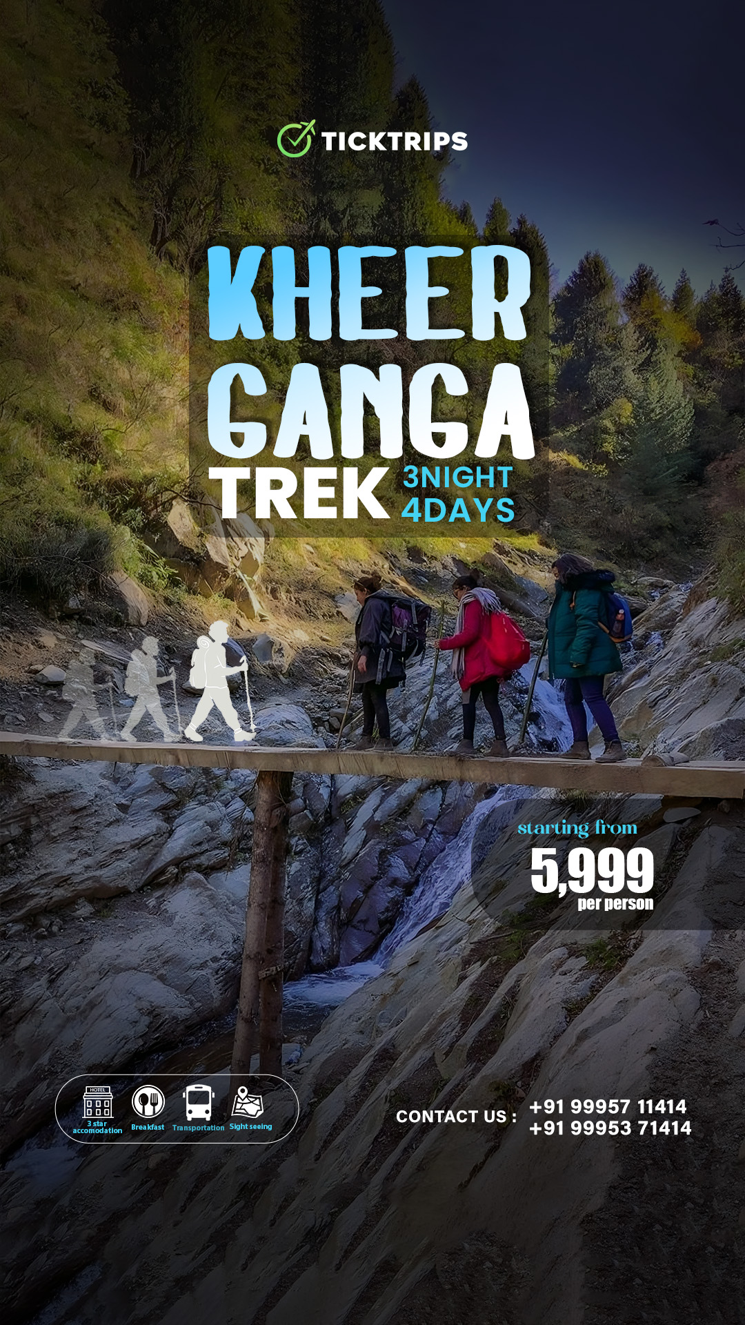 Trek into the heart of Himachal Pradesh with the Kheerganga adventure – where dense pine forests, sparkling waterfalls, and mountain trails lead you to natural hot springs and star-lit skies. Over 3 nights and 4 days, experience the raw charm of the Himalayas as you hike through serene landscapes, unwind in thermal springs, and camp under the open sky. With TickTrips, enjoy a well-organized trekking experience that includes accommodation, meals, transport, and guided support — starting from just ₹5,999 per person. Let the mountains refresh your soul, while we take care of everything else.