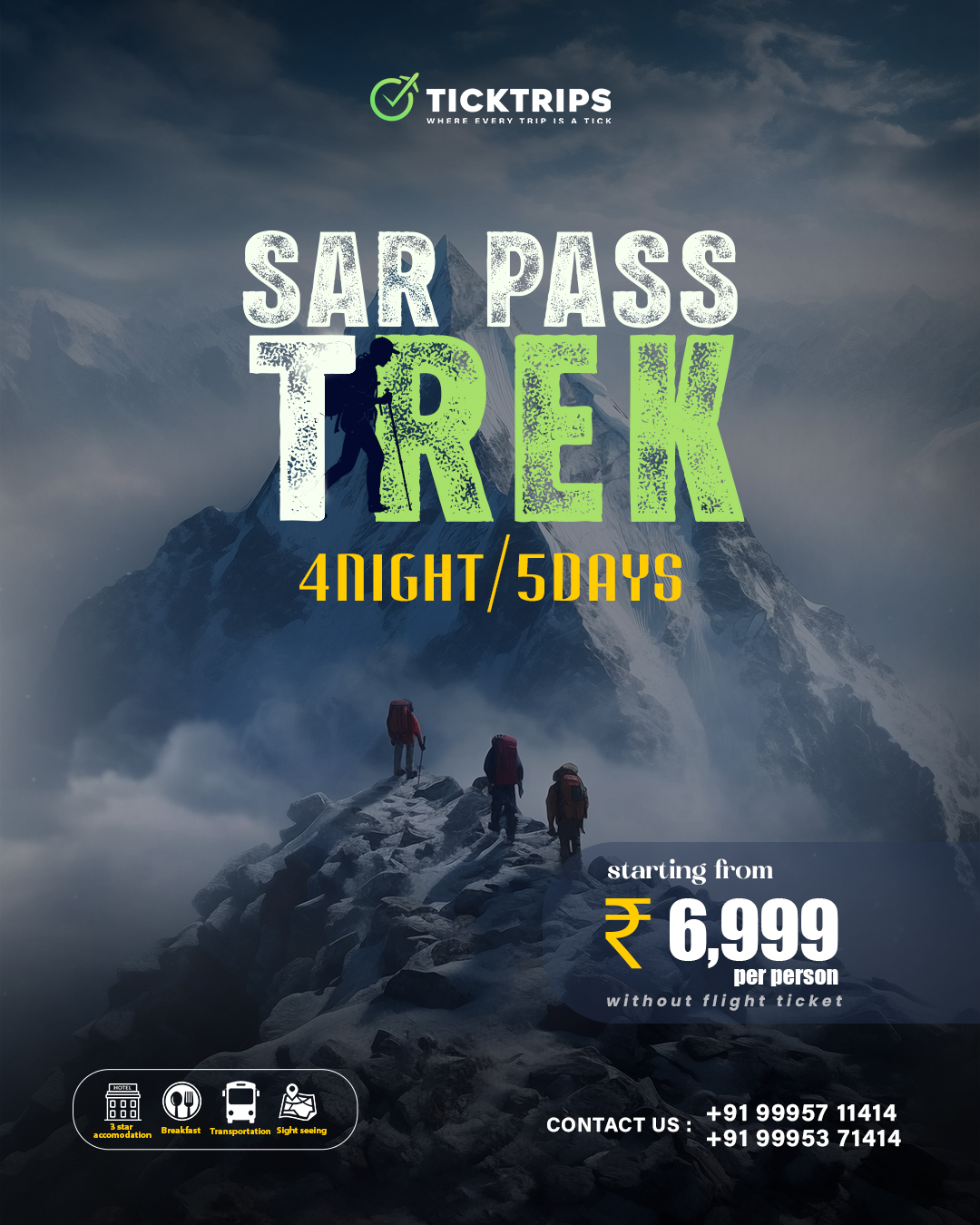 Nestled in the Parvati Valley, the Sar Pass Trek is a perfect introduction to high-altitude Himalayan trekking. Across 4 nights and 5 days, witness a stunning mix of dense forests, scenic meadows, snow-covered trails, and peaceful campsites. From the charming village of Kasol to the breathtaking views atop Sar Pass, every step is an adventure waiting to unfold. With TickTrips, enjoy a fully-guided trekking experience with meals, accommodation, transport, and expert support — all starting from just ₹6,999 per person. For those who crave thrill, beauty, and unforgettable memories — Sar Pass is calling.
