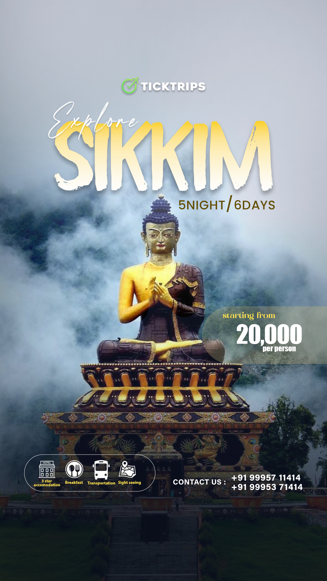 Escape to the serene land of Sikkim, where towering Himalayan peaks, peaceful monasteries, and vibrant culture await. Whether you’re wandering through misty valleys, visiting the majestic Buddha Park, or sipping tea at a mountain café, Sikkim offers an experience that’s soulful and refreshing. Enjoy 5 nights and 6 days of pure mountain magic with 3-star accommodation, daily breakfast, transportation, and curated sightseeing — starting from just ₹20,000 per person. Let TickTrips take care of the details while you soak in the views!